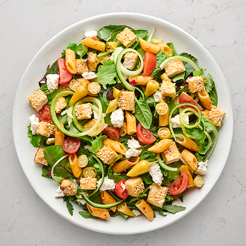 mit Sesam Tofu, scharfen Baby Pepperonis, Chili Pasta, Zucchini Ringen, Hirtenkäse, Cherrytomaten und Salat Mix, dazu empfehlen wir unser Sesam-Zitronen-Dressing